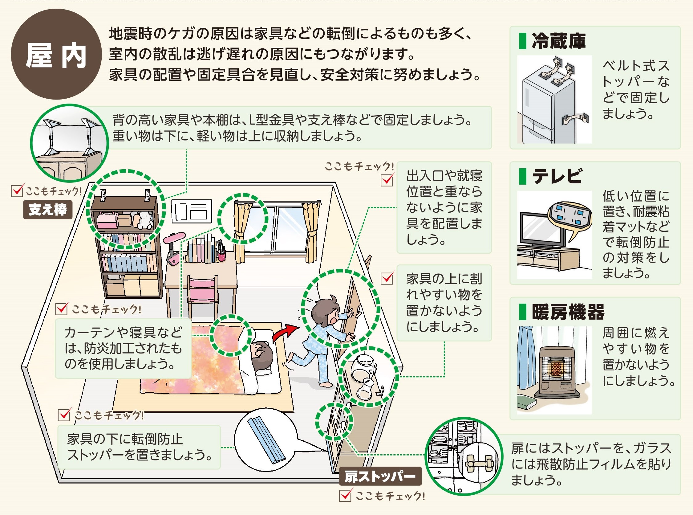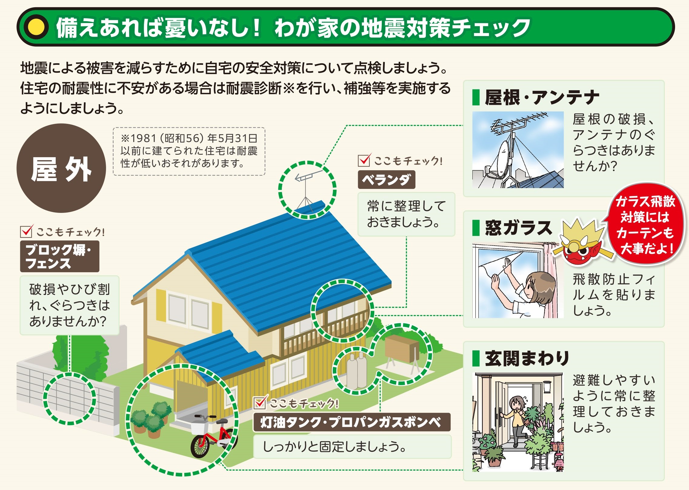地震は突然起こります。いつ揺れに見舞われても身を守ることができるように、屋内・屋外問わず周囲の状況や避難経路を確認し、揺れに備えましょう。