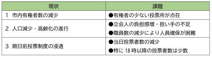 登別市選挙管理委員会では、平成15年に30投票区となって以降、公共施設の廃止に伴う統合などを経て現在26投票区としている投票区について、市内有権者数の減少や期日前投票制度の浸透が進んでいる近年の投票状況の中、投票所運営の適正化並びに投票環境の見直しが必要と考えています。