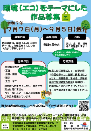 登別市及び登別市環境保全市民会議が主催した、環境(エコ)をテーマにした作品募集について、10月23日(木)に開催された登別環境保全市民会議にて審査を行った結果、次のとおり金・銀・銅賞の作品が選ばれましたのでお知らせします。