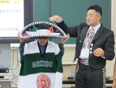 西陵中学校の吉井教諭を講師として迎え、メキシコ日本人学校派遣期間中のメキシコでの生活の様子や文化、メキシコ人の人柄などご自身の経験を語っていただきました。マリアッチの正装に身を包み、民族衣装や陶器、木工製品などをご披露いただきアステカ文化などにも触れることができました。