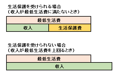 世帯の状況に応じて、国が定めた基準(世帯構成、年齢、居住地などによって異なる)で算定された最低生活費と、世帯全体の収入(働いて得た収入、恩給、年金、手当、仕送り、財産収入、預貯金、保険金、不動産売却収入など、世帯全ての収入を含む)を比較し、収入額が少ない場合にその不足する部分が生活保護費として支給します。最低生活費を超えているときは生活保護は受けられません。