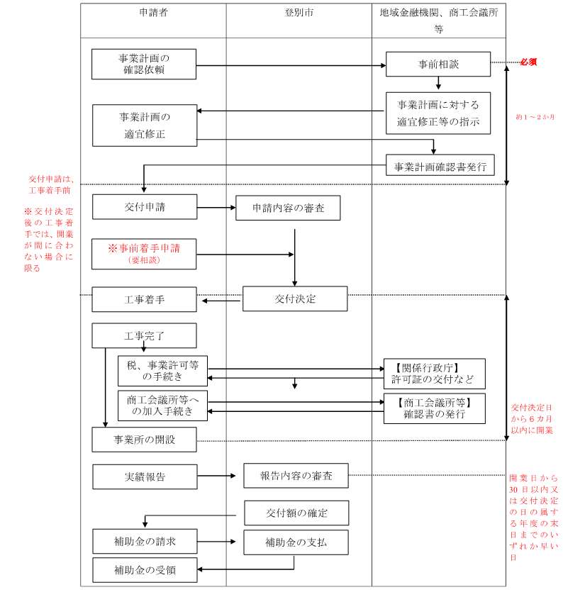 ※交付の決定の日から6月以内の日又は交付の決定の日が属する会計年度の3月末日のいずれか早い日までに営業を開始し、実績報告書等の提出ができることが条件となります。