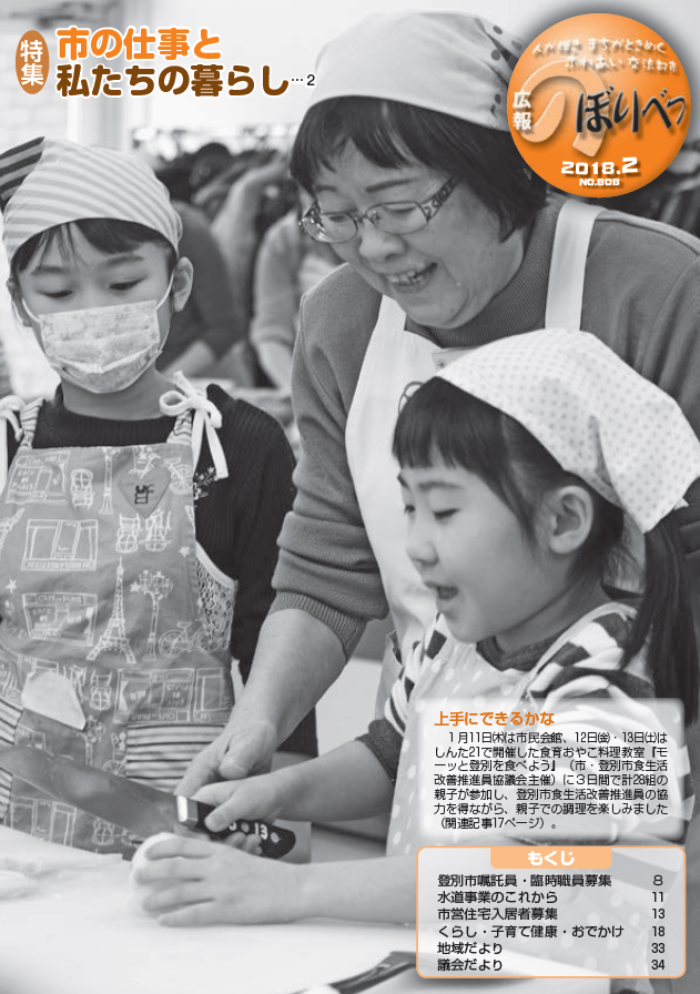 8・9ページ 登別市嘱託員募集 10ページ 登別市臨時職員を募集します 11ページ 水道事業のこれから~登別市水道事業経営戦略を策定~ 12ページ 知って備える防災メモ第61回 ~冬の災害に備えましょう~ 仲間たち ~ふれあい(バドミントン)~ 13ページ 平成29年度第4回市営住宅入居者募集 14ページ 登別育英会からのお知らせ~平成30年度奨学生募集~ 15ページ きらり ~外崎 真洋さん~ |