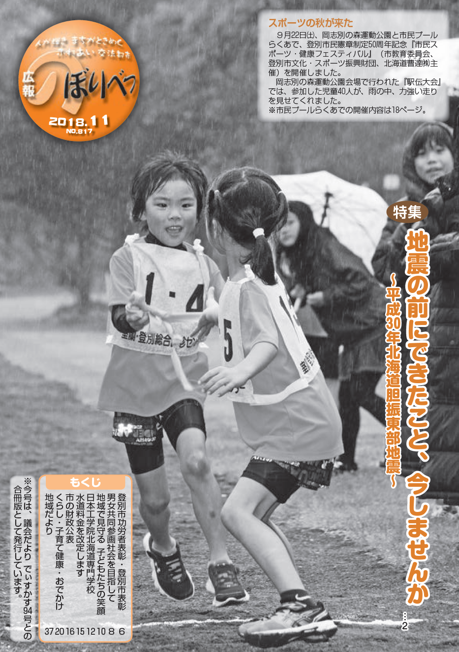 2~5ページ 地震の前にできたこと、今しませんか ~平成30年北海道胆振東部地震~ 6・7ページ 登別市功労者表彰・登別市表彰 8・9ページ 男女共同参画社会を目指して 10・11ページ 地域で見守る 子どもたちの笑顔 12・13ページ 日本工学院北海道専門学校 |