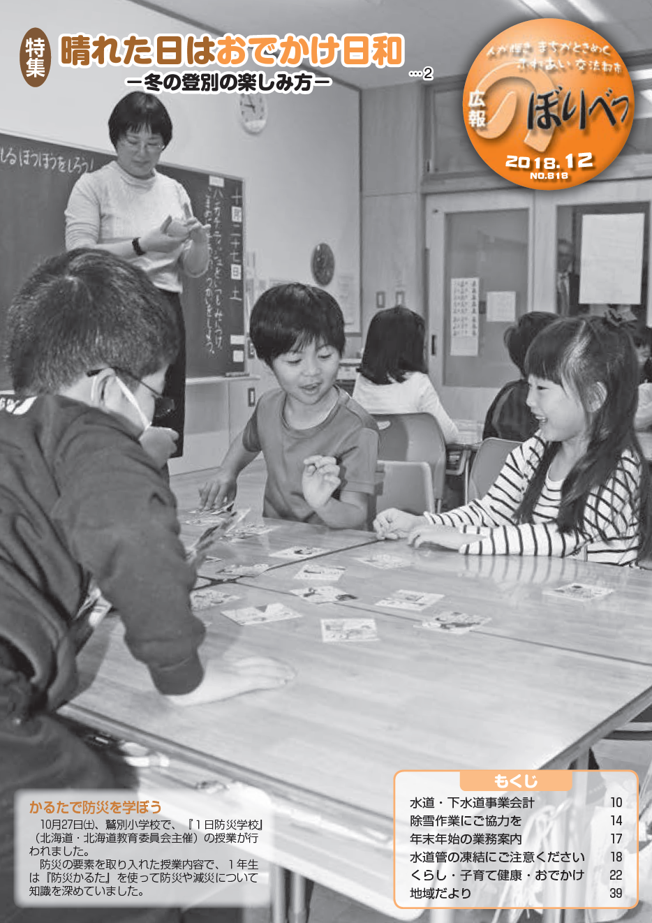 2~9ページ 晴れた日はおでかけ日和~冬の登別の楽しみ方~ 10・11ページ 水道料金の使われ方 12・13ページ 下水道事業の経営状況をお知らせします 14・15ページ 除雪作業にご協力をお願いします |