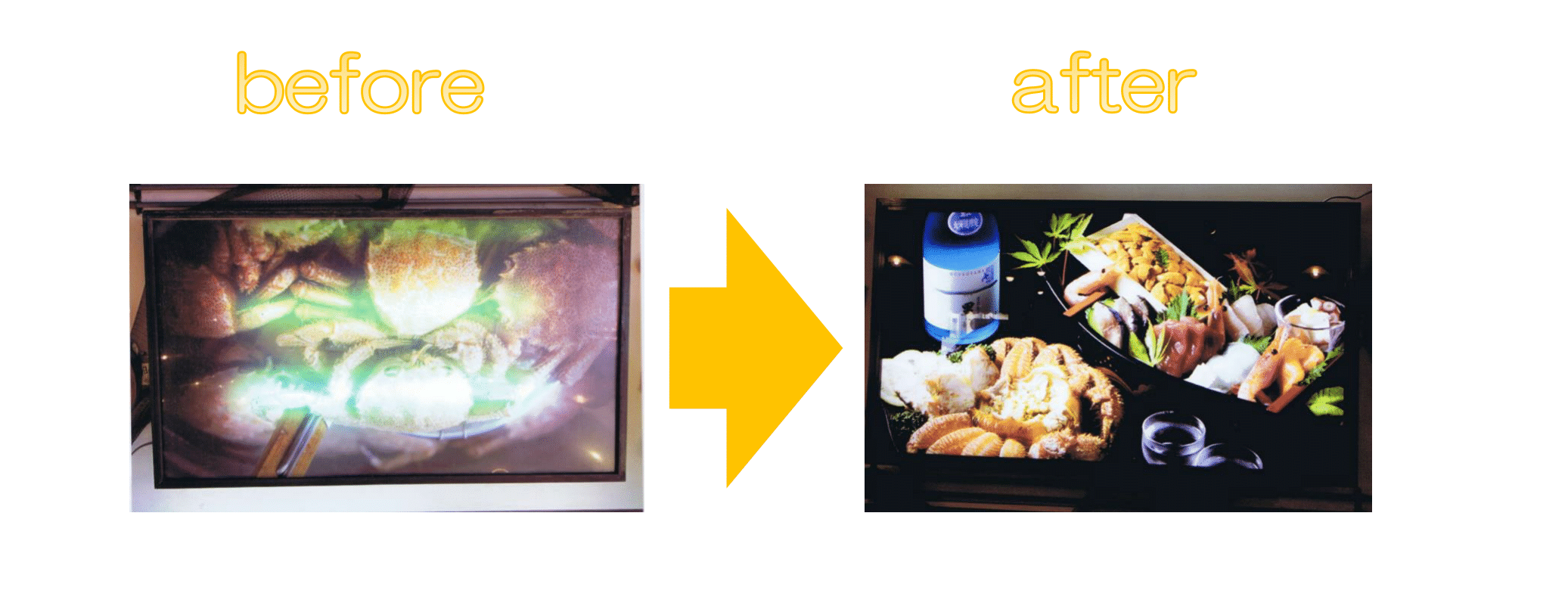 従来は物販を中心としていましたが、現在は飲食を提供しているため、それに併せ店内看板を料理等の飲食用看板に変更する工事を実施。一目でおすすめの飲食メニューがわかるようにするとともに、店外からも飲食用看板が見えるようにすることで、サービス・集客力の向上を図りました。