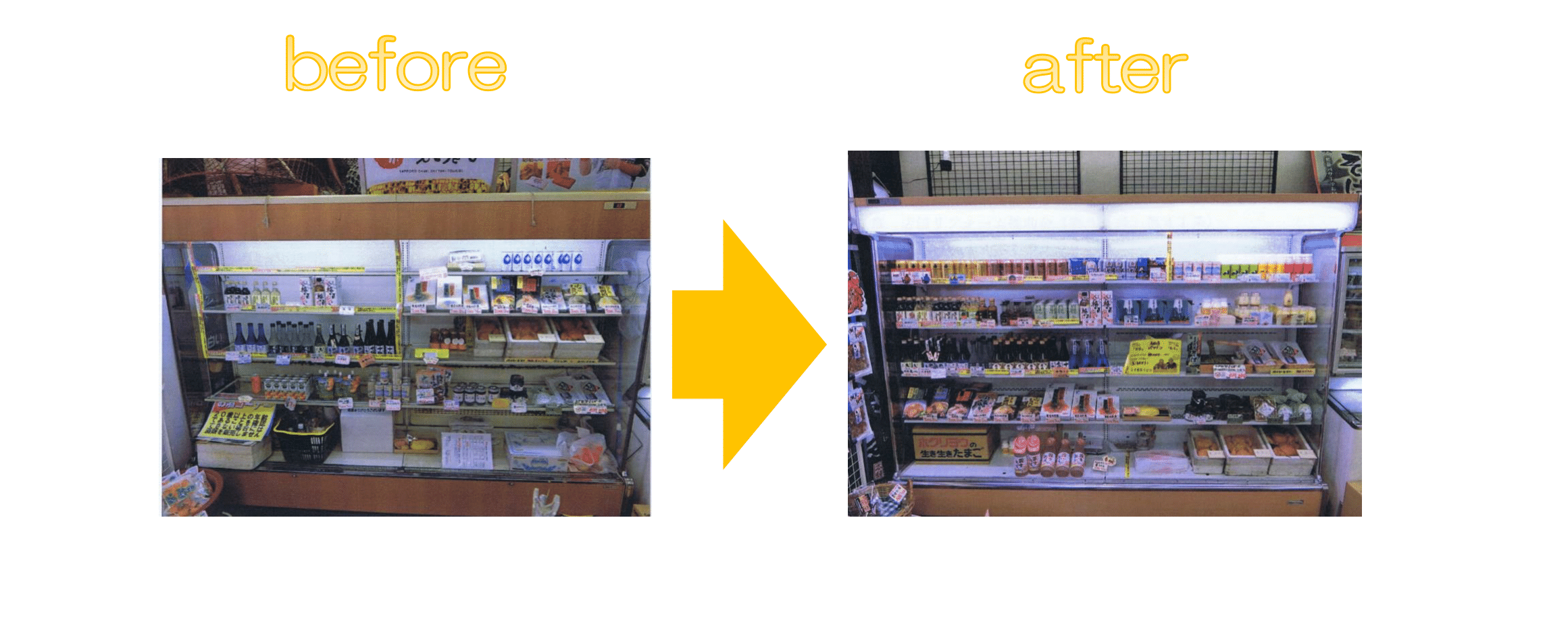 既存の冷蔵対面ショーケースでは、陳列できる品数が限られていましたが、新たに冷蔵ショーケースを設置(工事)することにより、陳列商品を大幅に増やし、数多くの商品を販売することが可能となり、集客力やサービスの向上を図りました。