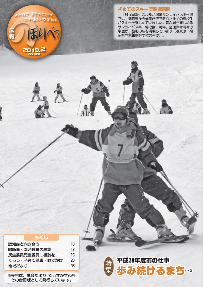 10・11ページ 認知症と向き合う 12・13ページ 登別市嘱託員を募集します 14ページ 登別市臨時職員を募集します 15ページ 民生委員児童委員にご相談ください 16ページ ・知って備える防災メモ第73回 ~雪による事故を防ぐ~ ・仲間たち ~クッキーズ~ 17ページ きらり ~志村奎祐さん(幌別町)~ |