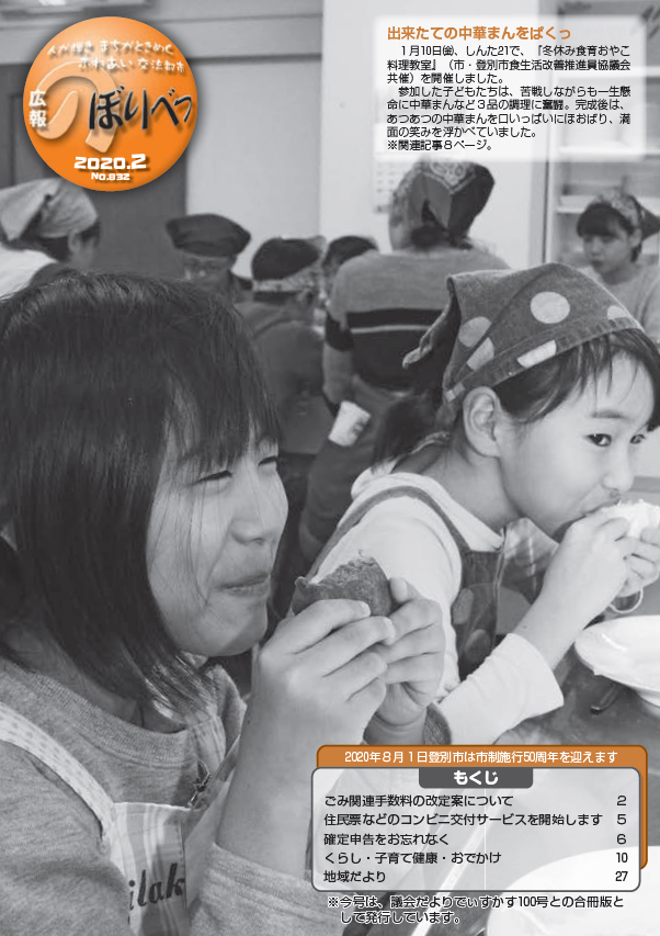 8・9ページ 東奔西走 ・子どもたちの憩いの場 ~幌別児童館(代替施設)オープン~ ・幸せを祈り、餅をつく ~元旦縁起もちつき~ ・地域のさらなる安全を願って ~令和2年登別市消防出初式~ ・作りながら楽しく学ぶ ~2020年登別市市制施行50周年記念 冬休み食育おやこ料理教室~ ・友好交流都市のきずな ~守山市の給食で『のぼりべつ牛乳』~ ・大人への第一歩 ~2020年登別市市制施行50周年記念 令和2年登別市成人祭~ ・多文化共生を肌で感じる ~2020年登別市市制施行50周年記念 令和元年度登別市中学生ニュージーランド派遣交流事業~多文化共生推進事業~~ |