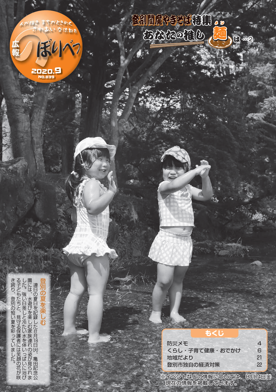 7ページ ・胆振幌別川の水位の上昇にご注意ください ・カムイヌプリ登山道周辺への立ち入りが禁止となります ・家屋の訪問調査を行っています ・ごみの収集日が変更になります ・自殺予防パネル展 ・講演会『第2回くらしの安全・安心セミナー』 ・写真で語る昔の話 ・ごみの減量化へのご協力をお願いします 8ページ ・令和2年度手話サポーター(手話推進支援員)養成講座 ・市長室フリータイム ・9月20日は登別市民憲章制定日です ・パブリックコメント(意見公募)について