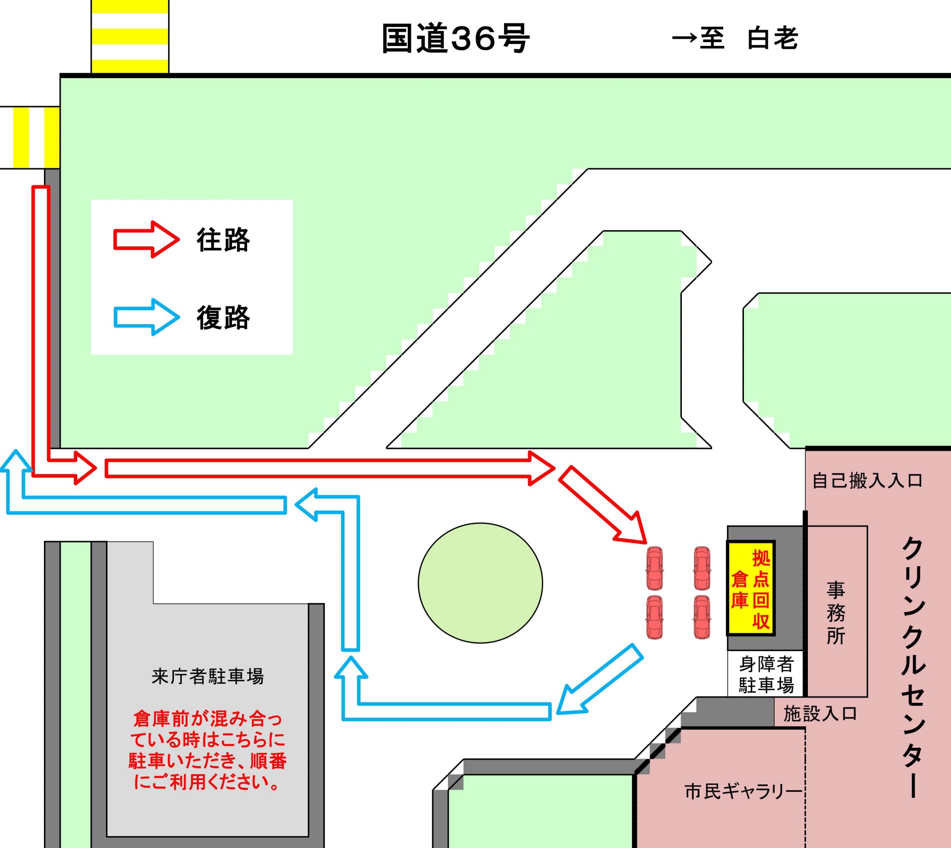 クリンクセンター入口から直進し、クリンクルセンターの事務所前に設置してある専用倉庫の前に車を駐車して、紙類ごみの種類別に分けられた専用倉庫へ紙類ごみを集積してください。